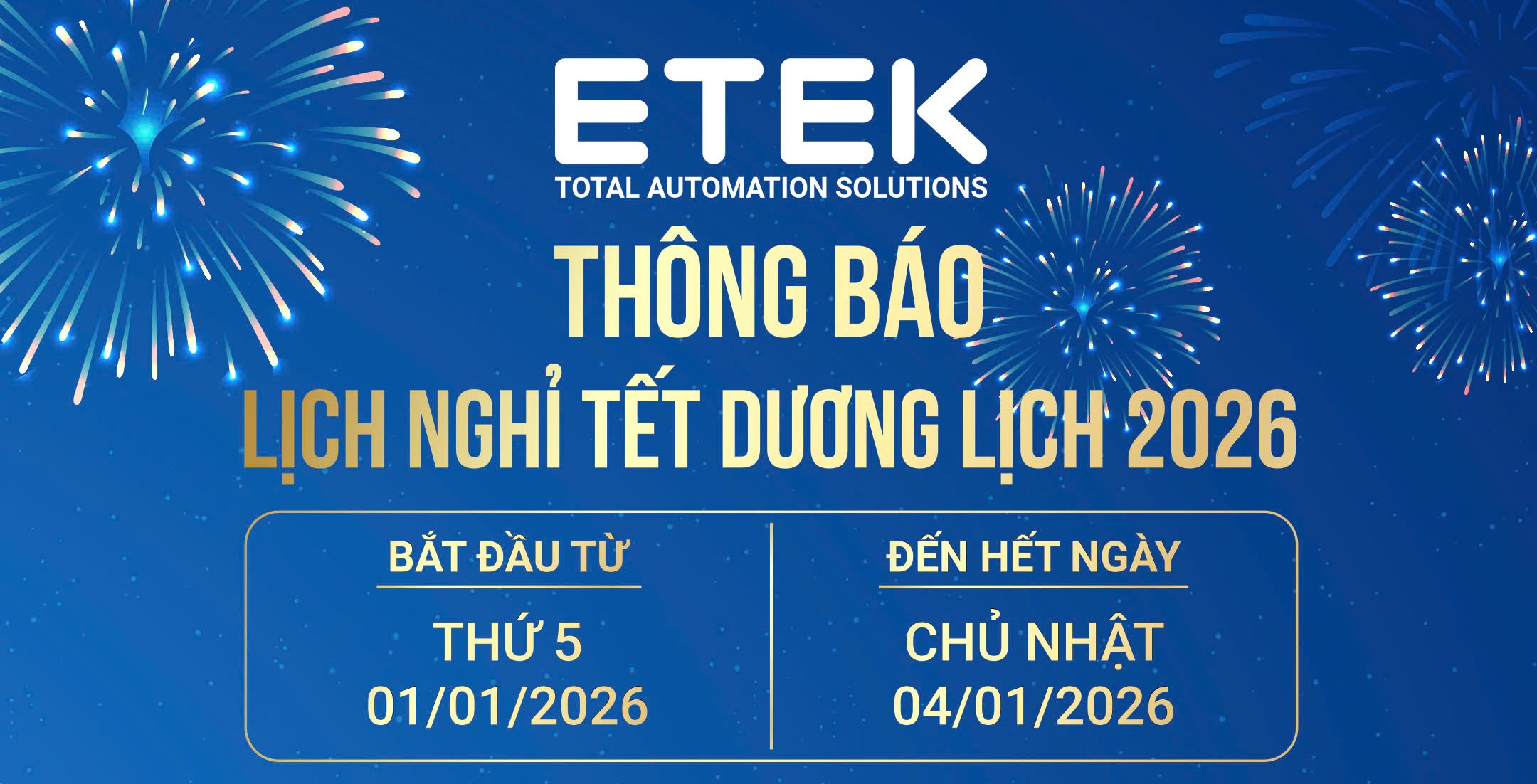 ETEK trân trọng thông báo đến Quý Khách hàng, Quý Đối tác và toàn thể Cán bộ Nhân viên lịch nghỉ Tết Dương lịch 2026 như sau: