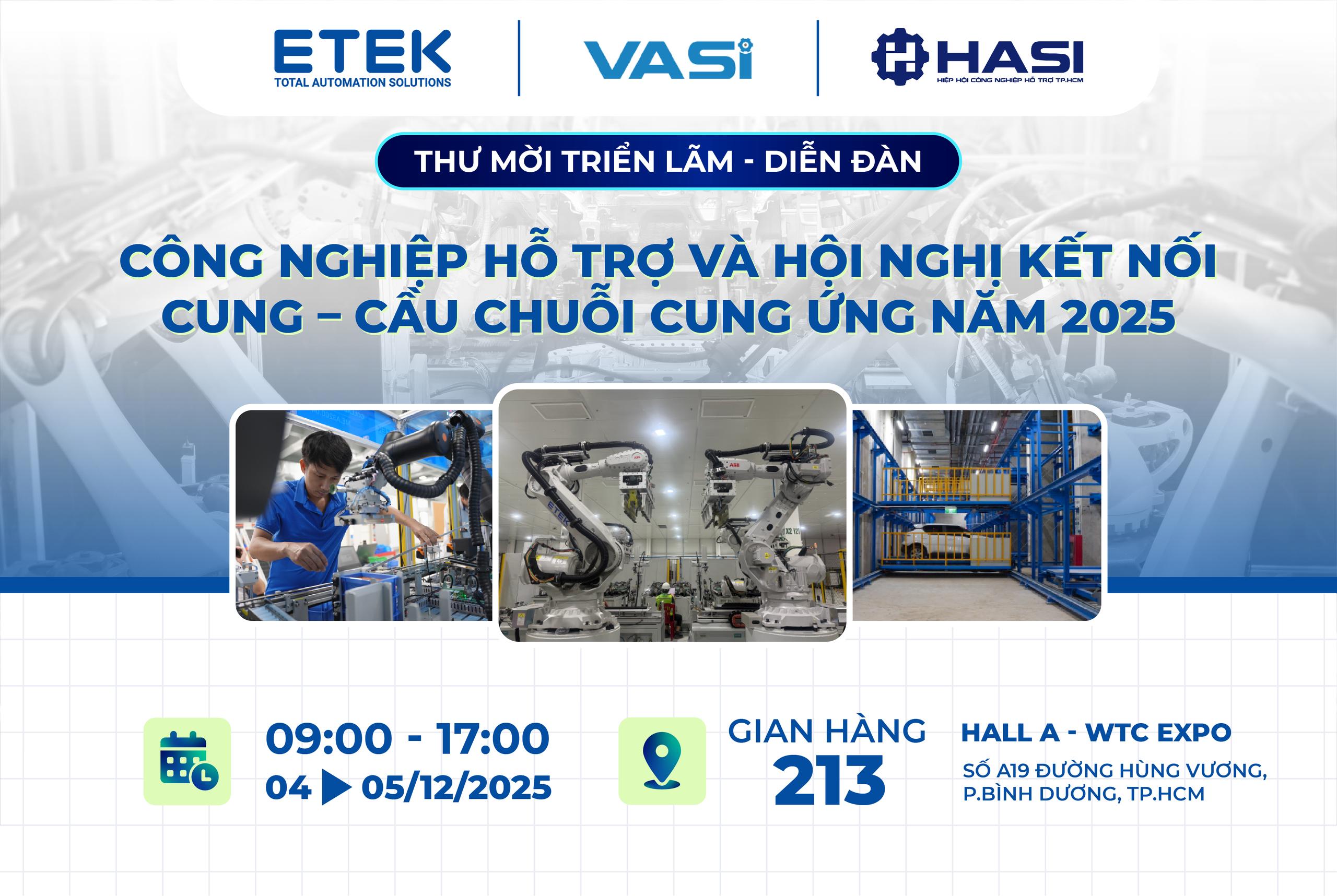 ETEK trân trọng kính mời Quý khách đến tham quan Triển lãm - Diễn đàn về CNHT và Hội nghị kết nối cung cầu chuỗi cung ứng 2025. Sự kiện mang đến không gian kết nối doanh nghiệp, cập nhật xu hướng sản xuất và mở rộng cơ hội hợp tác trong chuỗi cung ứng toàn cầu.